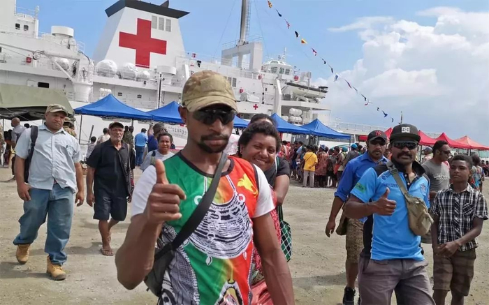 △在巴布亚新几内亚莫尔兹比港码头,民众纷纷点赞和平方舟医院船。江山 摄