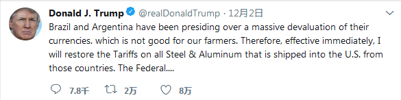 12月2日,特朗普在推特上表示恢复对进口自巴西、阿根廷的钢铁、铝加征关税