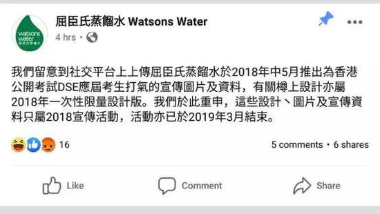 昨天下午,广州屈臣氏食品饮料有限公司在在屈臣氏蒸馏水这款产品的官方微博@屈臣氏蒸馏水 发布“关于屈臣氏饮用水产品包装澄清声明”,声明称:公司留意到近日有关针对屈臣氏饮用水2018年产品包装设计的不当理解,该产品包装设计属于2018年指定中国香港地区推出的一次性限量版,这些设计及推广只属于2018年宣传活动,活动已经于2019年3月结束,原创作意图为鼓励考试学生,为考生减轻压力。