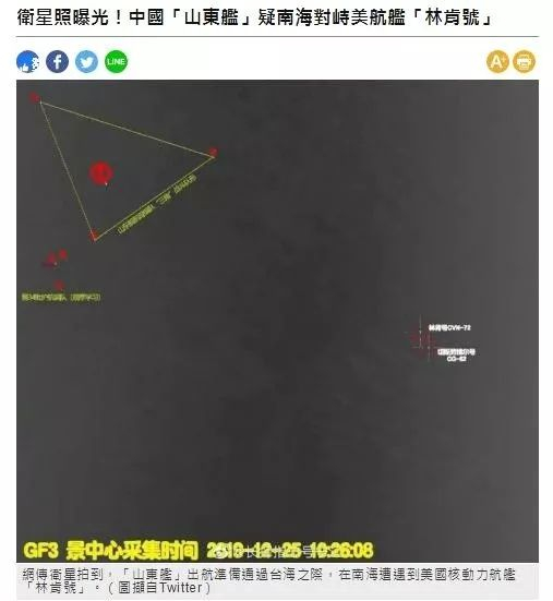 台媒报道截图:在卫星照片中,山东舰航母编队位于左上方(黄色字体三角连线区域),美军林肯号及护航巡洋舰位于右下方(白色字体)