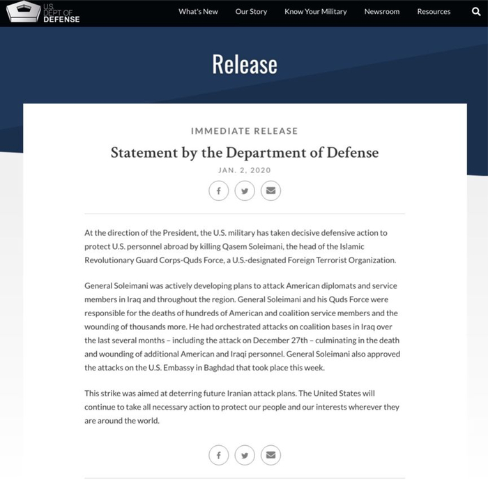 此次针对苏莱曼尼的军事行动被不少评论看作是伊朗伊斯兰革命以来美国针对伊朗最大胆的军事行动之一,无异于向伊朗宣战,伊朗国家电视台将这次事件描述为第二次世界大战以来美国“最大的误判”。