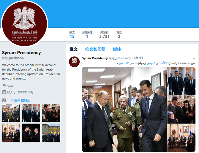 叙利亚总统府照片墙账号发布了新的推特账号页面链接,上面更新了俄叙两国领导人会谈的照片和视频。