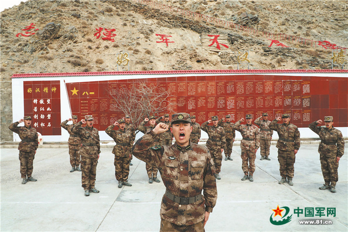“好汉墙”前,别迭里边防连指导员李国宽(前)同战友一同宣誓。王军强摄