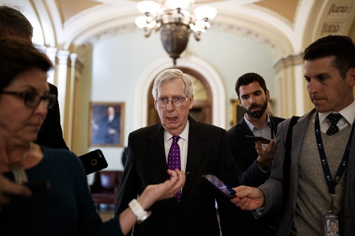 2019年10月17日,在美国华盛顿国会山,参议院多数党领袖麦康奈尔(中)投票后走出参议院。 新华社发