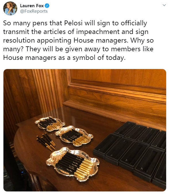 报道称,佩洛西逐一拿起这些钢笔,在针对特朗普弹劾条款的不同位置签字。随后,佩洛西把这些订制的签名钢笔作为收藏品分发出去——此举激怒了许多共和党人。