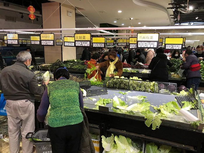 大学附近的一家超市内,市民则排起长队购买果蔬等生活用品。澎湃新闻在超市内看到,果蔬区内的包菜已经抢购一空,实时价格显示,兰州包菜1.98元/500g、大娃菜3.98元/500g、毛白菜3元/500g、高原娃娃菜和香菜均5.8元/500g。一位购菜的市民向澎湃新闻表示,蔬菜价格23日涨了很多,今年过年决定不走亲戚。