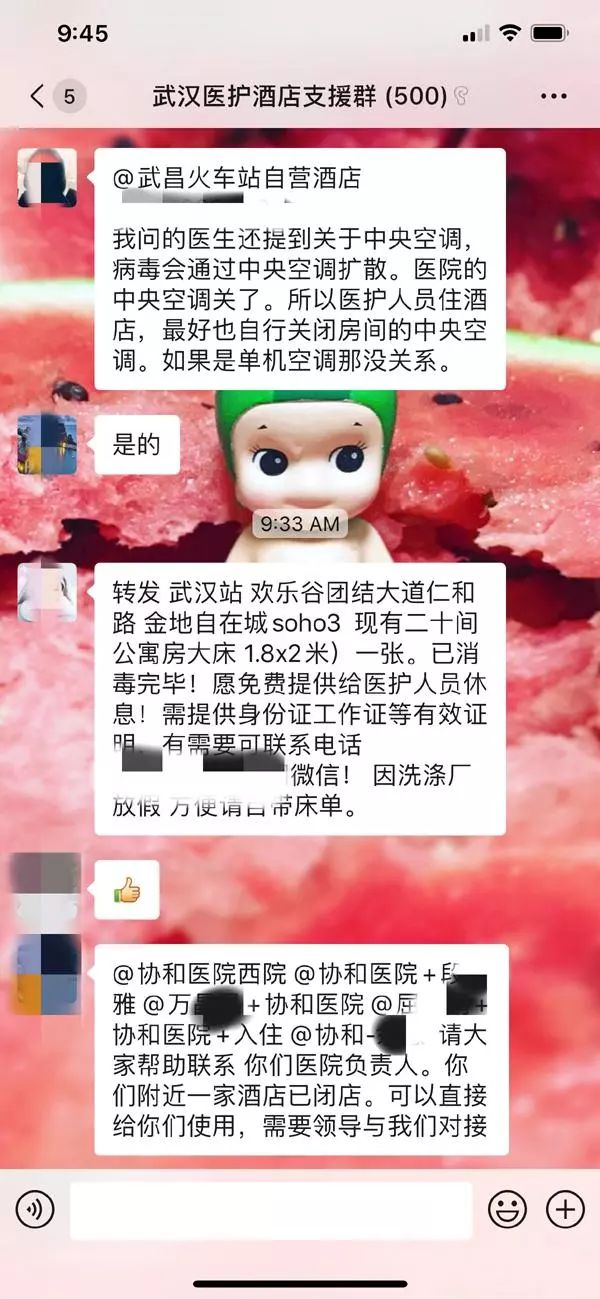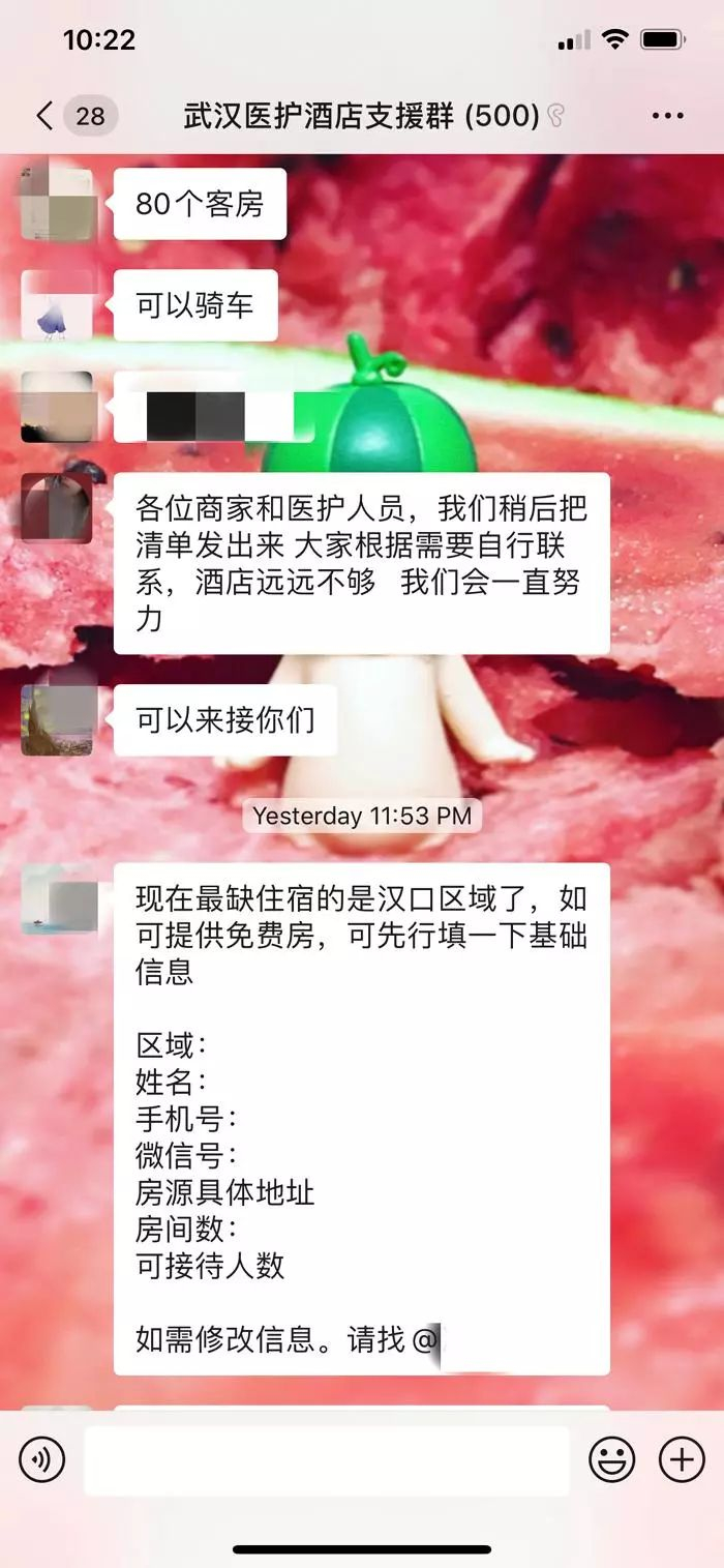 随着疫情的升级,武汉的医护人员极尽透支精力和体力。为了支援武汉的一线医护人员,1月24日,当地的酒店业人士自发组织“武汉医护酒店支援群”,征集不带中央空调的酒店自愿为武汉地区各大医院的一线医护人员免费提供住宿。
