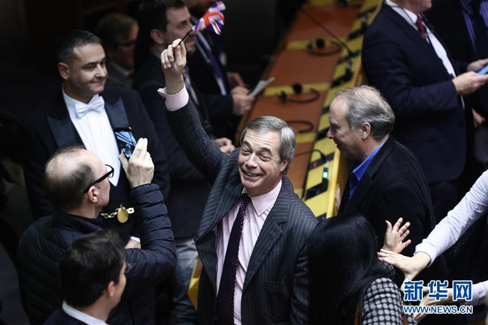 1月29日,在比利时布鲁塞尔,英国“脱欧党”领袖、欧洲议会议员奈杰尔·法拉奇在英国“脱欧”协议投票结果公布后庆祝。 新华社记者 郑焕松 摄