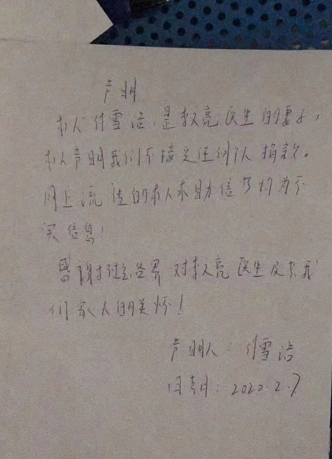 付雪洁在声明中表示:本人付雪洁,是李文亮医生的妻子,本人声明我们不接受任何个人捐款。网上流传的本人求助信等均为不实信息!感谢社会各界对李文亮医生及对我们家人的关怀!
