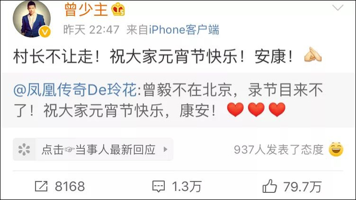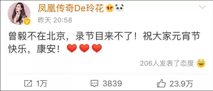 到了晚上9点左右,玲花率先更新微博向大家解释。她说,曾毅是因为不在北京,无法到现场录制节目。
