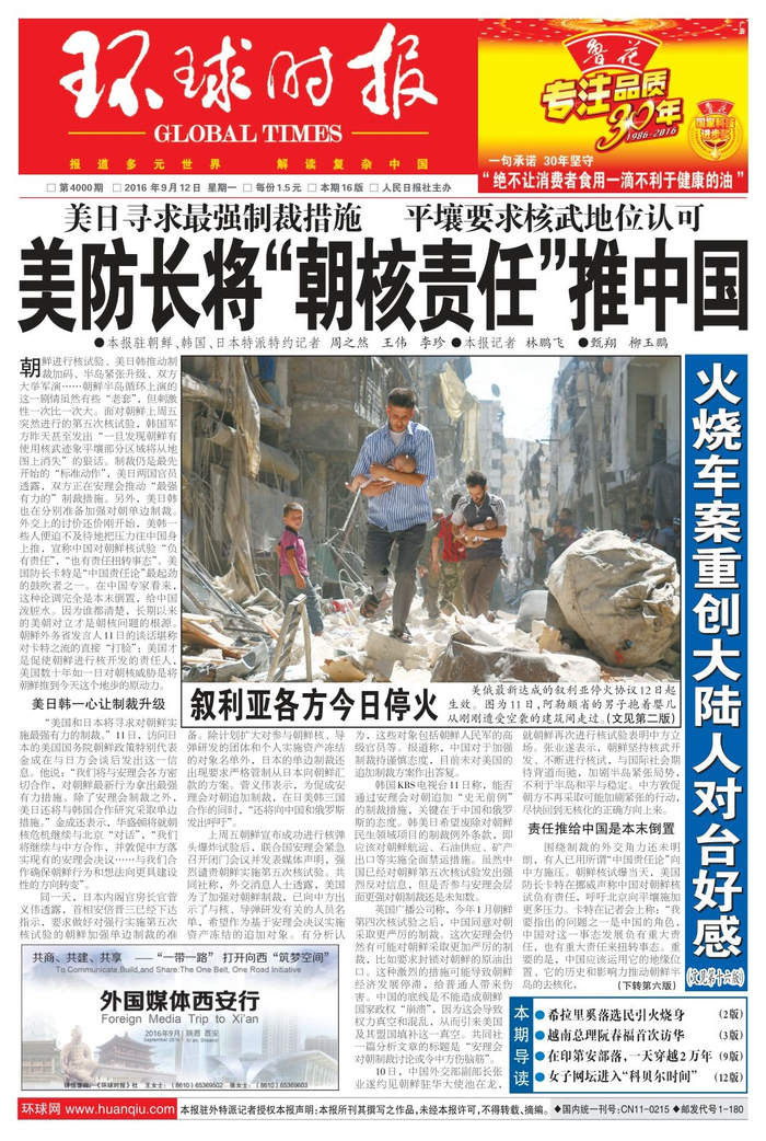 2016年9月12日第4000期《环球时报》↓