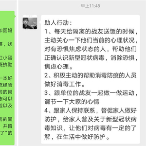 疫情期间,限制外出、滞留家中、隔离观察等,增加了独处的时间,大家感到难受、焦虑是正常的。“助人行动,我还可以这样做”可以构建人与人之间的连接,增强大家共同面对和战胜病毒的信心。