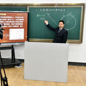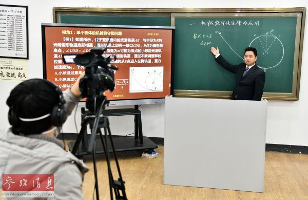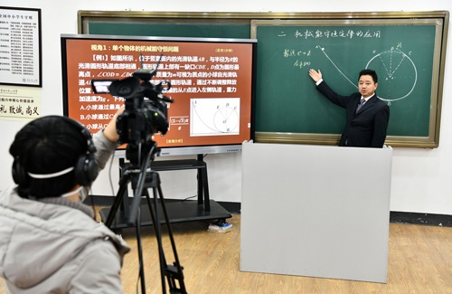 2月13日,贵阳市第六中学的老师徐忠在录制远程网络物理课程。(新华社)