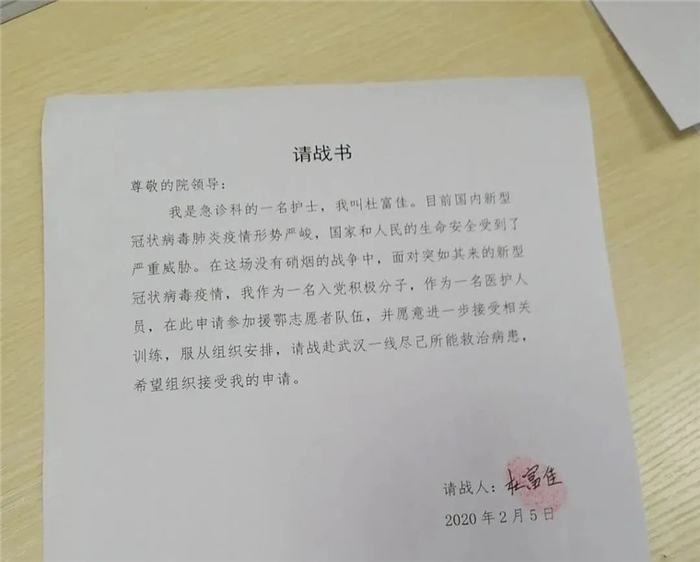 她所在的贵州省湄潭县人民医院被指定为贵州省开设新冠肺炎发热门诊的183家定点医疗机构之一。1月27日,在接到医院发出的加入抗击新冠肺炎倡议书后,杜富佳第一时间报名。2月5日,杜富佳再次提交了支援武汉抗疫一线的请战书。