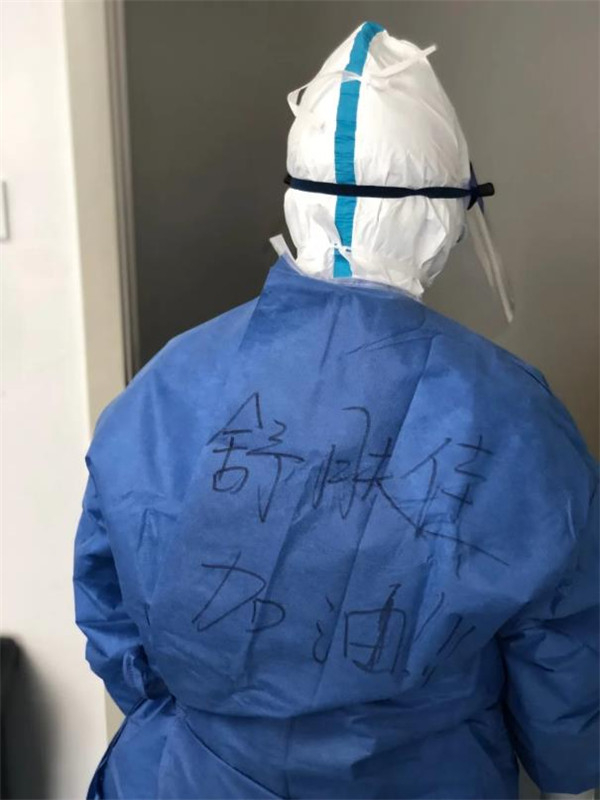 出门右转几步,就是病房的入口。因为要进病房,杜富佳今天在白色防护服外,又套了一层蓝色隔离服。隔离服的后背上,写着五个字:舒肤佳,加油!“舒肤佳”,这是她的昵称,也代表她的职责与爱心。