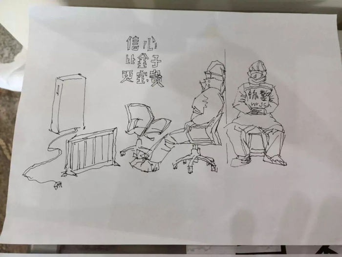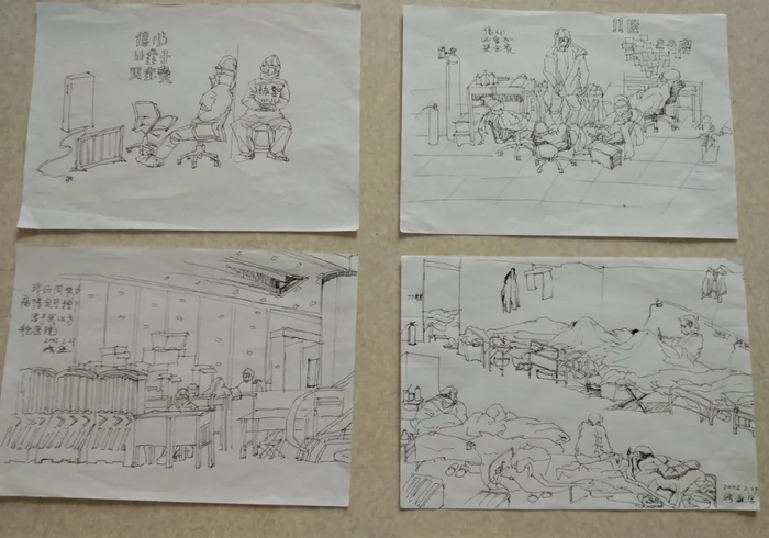 他说,其中一张画是凌晨四点他起床时看到的景象,夜班的医护人员疲惫不堪,却还在商讨工作方案,组长站在当中,其他医护都歪歪斜斜躺在椅子上强打精神。