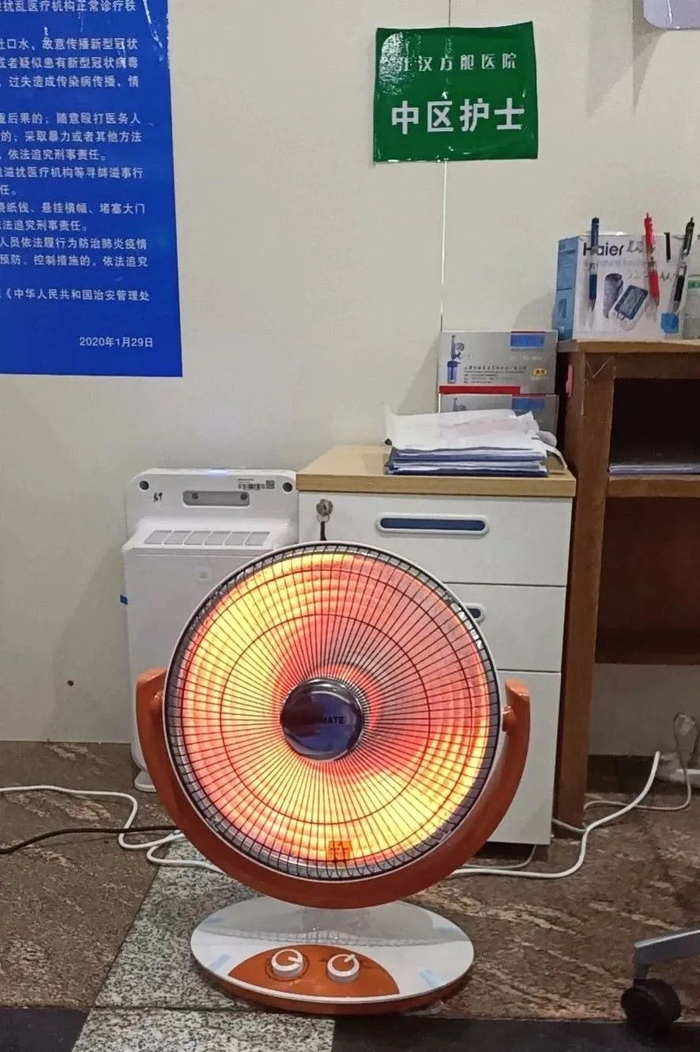大雪天,江汉方舱添置了“小太阳”取暖器