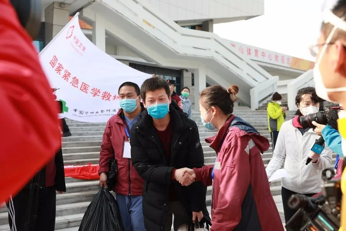 武汉客厅方舱医院宁夏医疗队护士冯文送患者出院