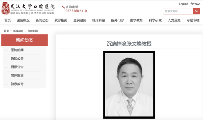 3月26日,武汉大学口腔医学院官网发布讣告称:我国口腔颌面外科知名专家、中国共产党党员,武汉大学口腔医学院口腔颌面头颈肿瘤外科张文峰教授,因病医治无效,于2020年3月26日0点39分逝世,享年61岁。