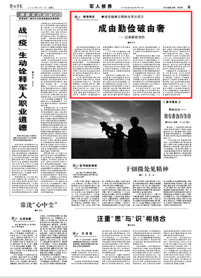 作为新时代革命军人,我们更要努力从自身做起,自己首先做好,使自己成为厉行节约的行动者、勤俭办事的践行者、良好风气的引领者。广大官兵理应带头树立正确的价值观、幸福观、消费观,自觉追求高尚道德情操和健康文明生活方式,做勤俭节约风尚的引领者,把节约一度电、一滴水、一张纸贯穿于生活的点点滴滴,把减少办文、办公、办会成本渗透到工作的方方面面。做到生活再富裕,始终不忘中华民族艰苦朴素的传统美德;环境再变化,始终不丢人民军队勤俭建军的光荣传统;条件再改善,始终不变革命军人艰苦奋斗的政治本色。