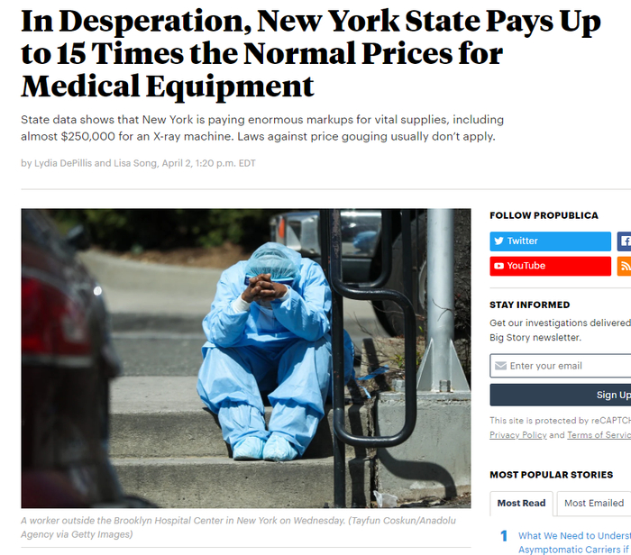 央视新闻4月5日消息,美国新闻调查网站ProPublica报道,随着新冠疫情的暴发,美国对医疗用品和设备的需求达到前所未有的水平。