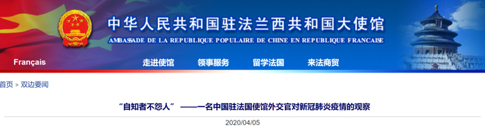 5日,中国驻法国大使馆官网发布文章《“自知者不怨人” ——一名中国驻法国使馆外交官对新冠肺炎疫情的观察》,以下是文章全文。