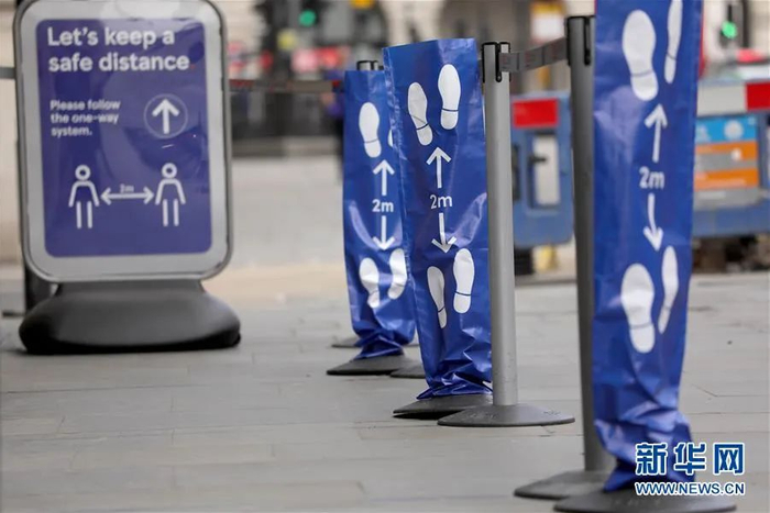 ▲这是4月8日在英国伦敦一家超市门外拍摄的提醒人们保持安全距离的参照物。受新冠疫情影响,英国伦敦很多公共场所都采取措施引导民众保持“社交距离”。新华社发(蒂姆·爱尔兰 摄)