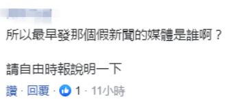 对于《自由时报》的这则假消息,有岛内网友称,“所以最早发那个假新闻的媒体是谁啊?请自由时报说明一下”。