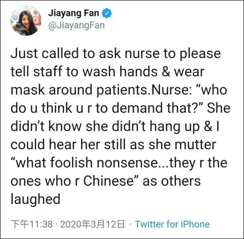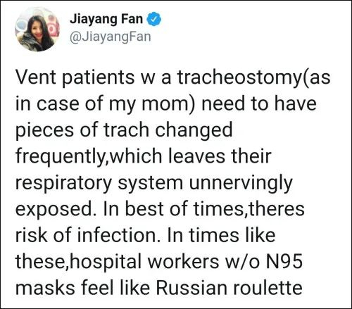自己雇佣的一名护工告诉她,医院的医生还是没有戴上口罩工作,她又发了个推特: