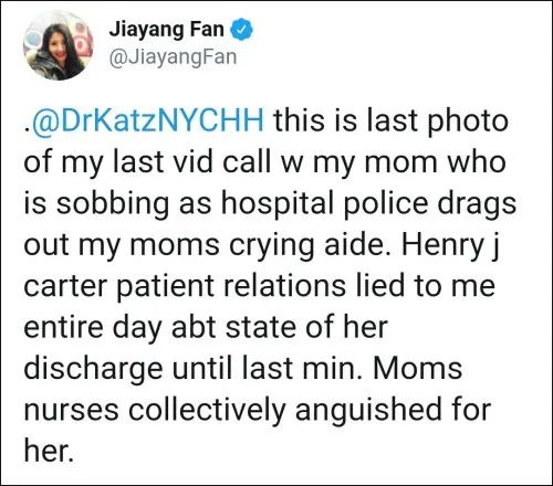 长年住院的母亲,还是隐隐约约地得知了美国正在经历着一场前所未有的疫情。