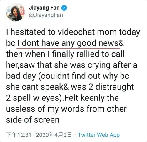 自己已经很是焦虑,生怕自己再把这份焦虑传递给母亲,尤其是每一天醒来,都没有听到任何关于疫情的好消息。