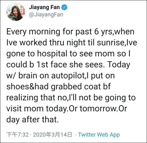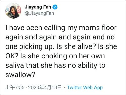 当新冠疫情开始在美国爆发,尤其是新闻不断爆出某某养老院、某某看护中心的老年人发生群聚感染,樊嘉扬便开始担心起自己的母亲。