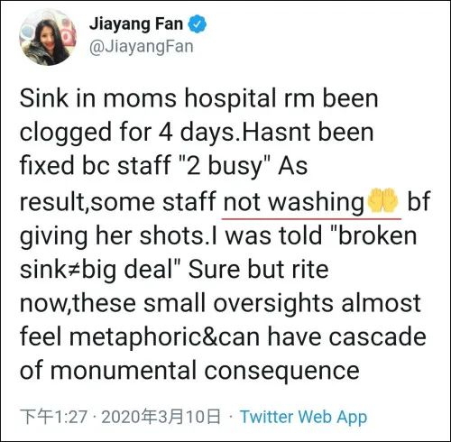 母亲告诉她医院的水槽坏了四天,没有人修,她发个推特: