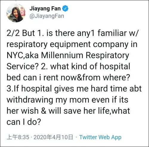 现在的樊嘉扬已经指望不上医院还能照顾好自己的母亲,她只想着能不能在偌大的美国租到一台呼吸机,然后跟医院签免责书,把母亲接回家中。