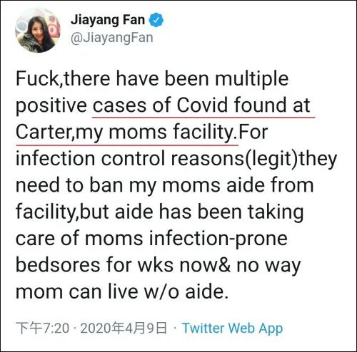 同时,她还称自己担心照顾母亲的医生、护士会打击报复。