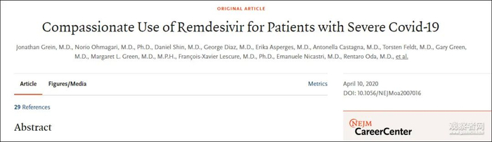 4月10日,《新英格兰医学杂志》刊登了一份瑞德西韦在同情用药情况下治疗重症新冠肺炎患者的研究报告。结果显示,68%的患者在用药后症状出现改善,13%的患者结束疗程后死亡。