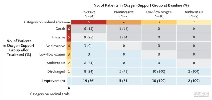 结果这53名重症患者中,有36人(68%)症状减缓,使用呼吸机的30名患者中有17名实现拔管,最终有25人出院;有8人症状恶化,其中7人(13%)死亡;其余人症状未发生改变,其中1人至今仍需ECMO存活。