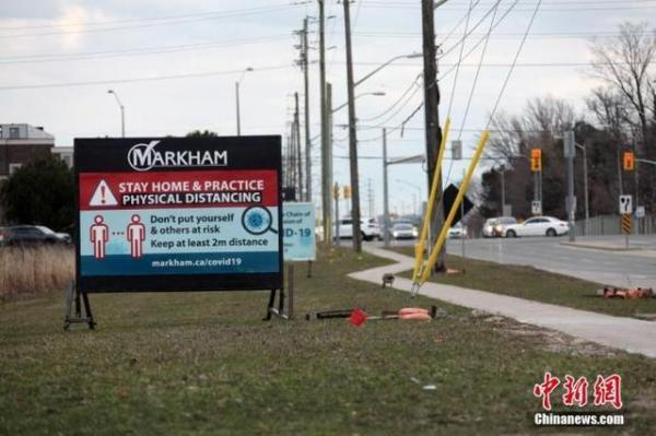 当地时间4月11日,复活节假期,加拿大大多伦多地区万锦市公路边竖有醒目的告示牌,提醒民众注意保持物理距离,防止病毒传播。中新社记者 余瑞冬 摄