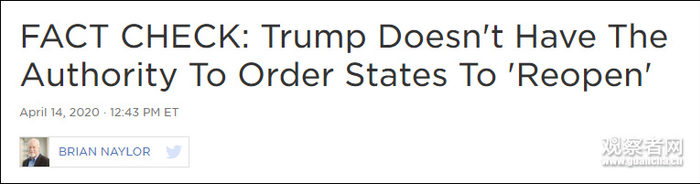 特朗普此番言论实则涉嫌违宪。美国《宪法》第十修正案,即各州拥有相对独立的自主权,州政府有权管辖公共福利相关领域。也就是说,特朗普无法干涉各州制定的疫区封锁政策。