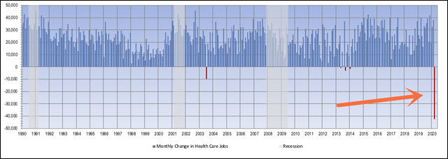 1990-2020年每月医疗岗位数变化图(红色表示岗位减少) 图自 “Altarum”网站