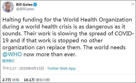 比尔盖茨在社交媒体上发声:“WHO的工作就是减缓新冠肺炎的传播速度,如果这项工作被停止,那就没有其他组织能顶上了。现在,世界比以往任何时候都更需要WHO。”