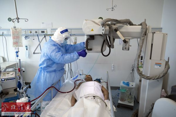 4月11日,武汉,在华中科技大学同济医学院附属同济医院中法新城院区ICU病房,医生正为一名新冠肺炎危重症患者做肺部X光片。(新华社)