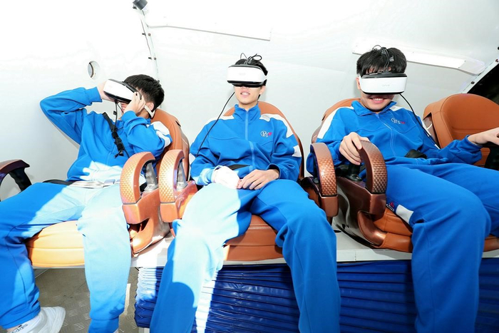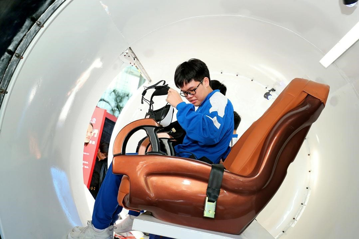 在讲解员的带领下,澳门学生们逐次走过各个展区。两弹一星、长征火箭、探月工程、深空探测、空间站等航天模型静默而立,讲述着我国在航天领域取得的辉煌成就。最受澳门学生们欢迎的项目之一是航天展区,这里有展示中国航天及探月工程的展品,只要坐上专门设立的VR体验座椅,带上VR眼镜,就能切身感受航天员从舱内走出舱外,来自视觉和感触的真实体验。