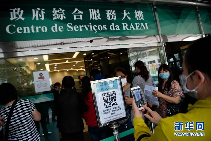 3月2日,市民在进入澳门黑沙环政府综合服务大楼前扫码填写“健康声明”。新华社记者 张金加 摄