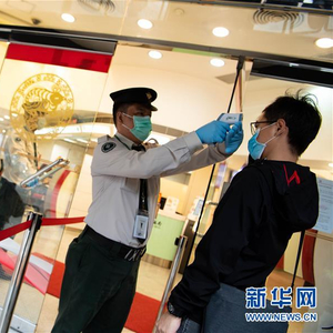 3月2日,工作人员在澳门高士德中国银行澳门分行为办理业务的市民测量体温。新华社记者 张金加 摄
