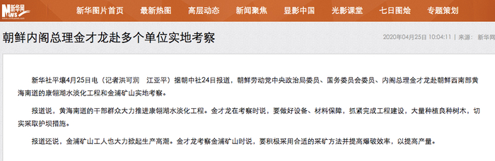 据朝中社24日报道,朝鲜劳动党中央政治局委员、国务委员会委员、内阁总理金才龙赴朝鲜西南部黄海南道的康翎湖水淡化工程和金浦矿山实地考察。