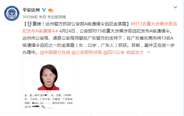 四川省达州市公安局官方微博25日消息,达州市公安局、渠县公安局民警在广东警方的支持下,在广东省东莞市将13名A级通缉令逃犯之一的金某霞(女,22岁,广东人)抓获。目前,案件正在进一步办理中。