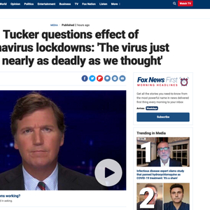 据福克斯新闻报道,27日的节目一开始,卡尔森播放了一段两名加州医生对此次新冠病毒大流行进行分析的视频。“这些人都是些(做事)认真的人,几十年来他们就搞这些。在这个问题上,他们掌握着目前现有最大的数据集。”卡尔森称,“在分析了所有这些数据后,他们提出问题‘这些封锁措施值得吗?’所以,这个问题的答案又是什么?”