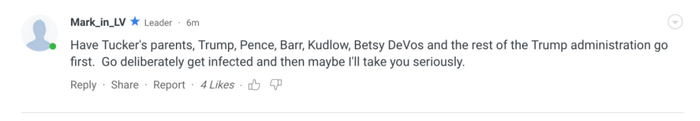 另一名网友评论说,“让塔克的父母、特朗普、彭斯、巴尔(司法部长)、库德洛(白宫国家经济委员会主任)、贝齐·德沃斯(教育部长)与特朗普政府的其他人先来,去故意被感染,然后我或许会认真对待你(说的)。”↓