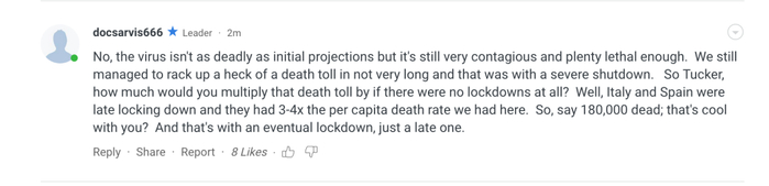网友docsarvis666写道,“不,这种病毒不像最初预测的那般致命,但它仍然具有很强的传染性,足够致命。我们伴随着一场严重的停摆,还是在很短的时间内积累了大量的死亡病例。所以,塔克,如果没有封锁措施,你(想想)你要把死亡总数翻多少番?意大利与西班牙实行封锁措施晚了,他们的死亡率是我们这里的3至4倍。所以说18万人死亡,你觉得很酷吗?”↓